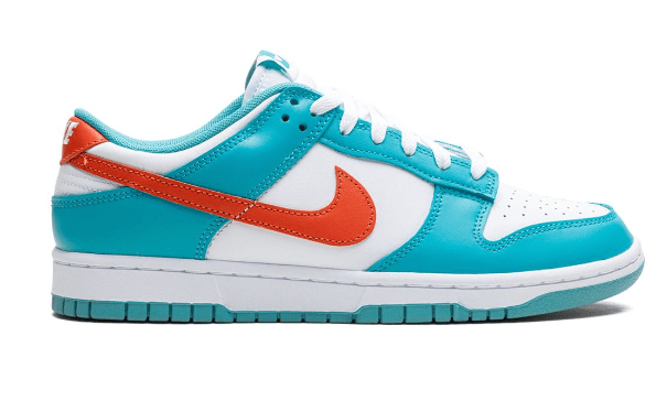 Side view of Nike Low Dunk Retro sneakers in white with turquoise and red accents, featuring a sleek design and signature Nike swoosh.